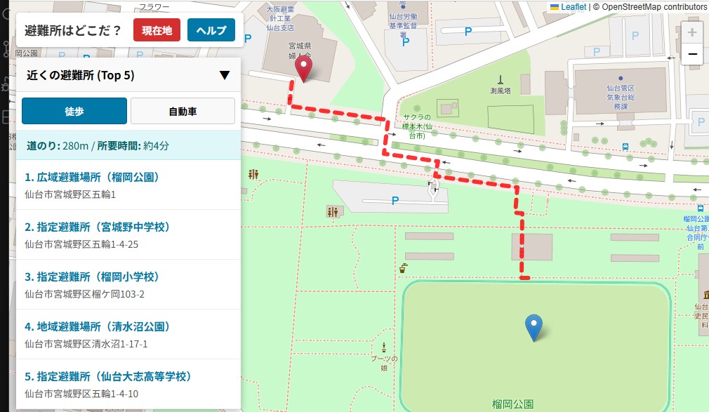 仙台市のオープンデータポータルを利用した、避難所までの道案内をするサービスです。